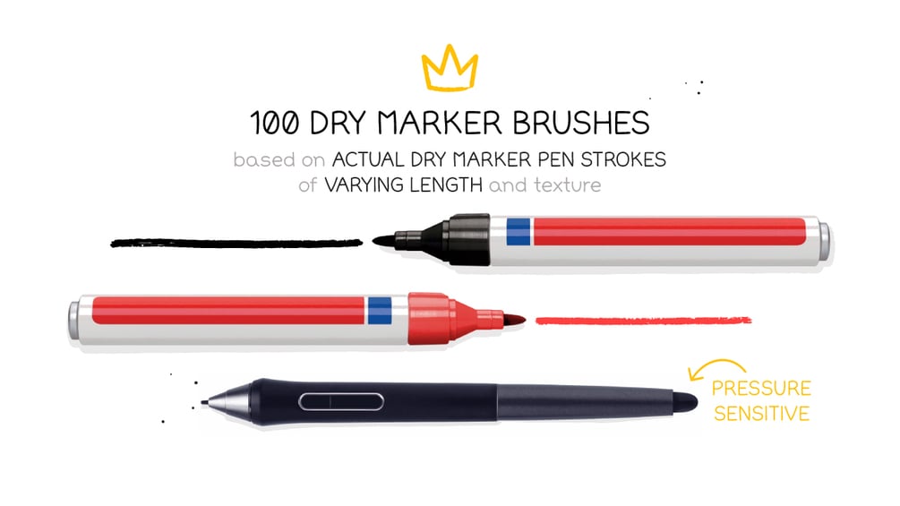 100 pressure sensitive, dry marker brushes for Adobe Illustrator CS5 or higher.