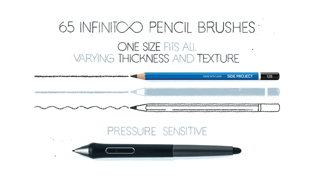 65 pressure sensitive Infinito pencil brushes for Adobe Illustrator CC.